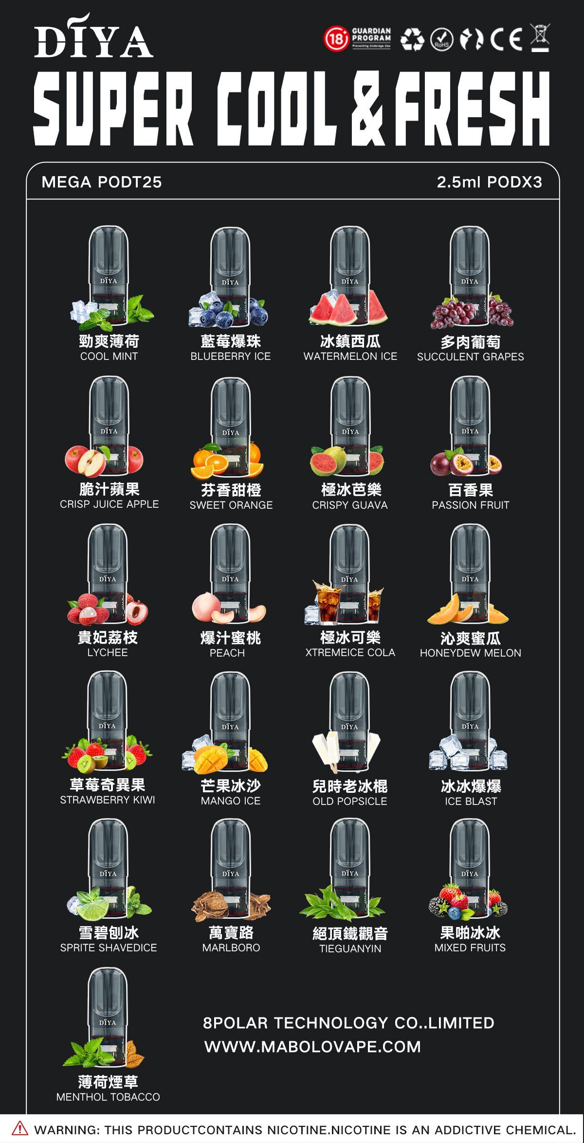 DIYA煙彈(馬來西亞版)每盒包含三顆通用一代煙彈,適合悅刻主機一代使用,讓您享受順暢的吸入體驗與飽滿的煙霧效果。